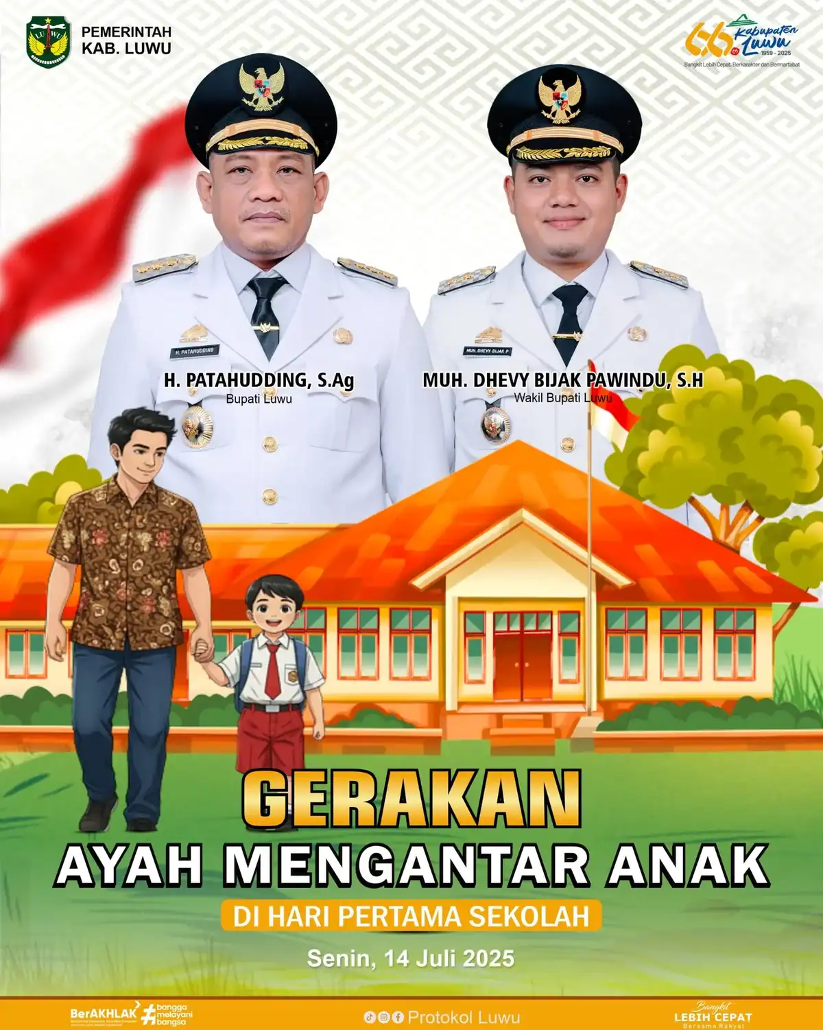 LUWU, SPIRITKITA – Bupati Luwu, H. Patahudding, mengimbau seluruh ayah dan wali murid untuk turut serta mengantar anak-anak mereka ke sekolah pada hari pertama tahun ajaran baru 2025/2026 yang dimulai Senin, 14 Juli 2025.