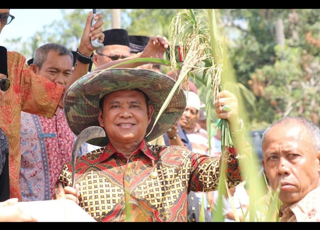 Bupati Luwu, H Basmin Mattayang melakukan panen perdana Padi bersama masyarakat desa Tabbaja kecamatan Kamanre kabupaten Luwu, Rabu, (2/10/2019).