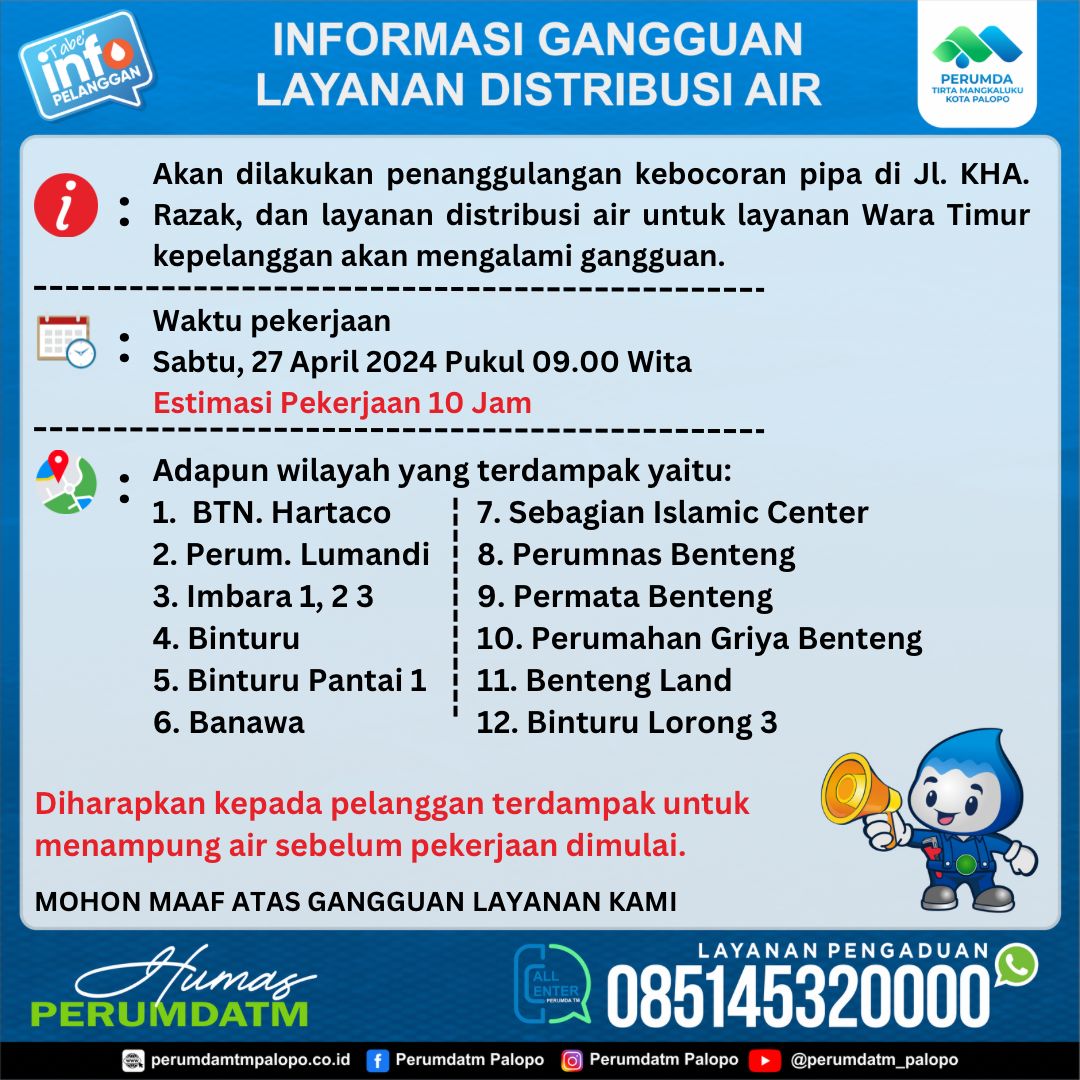 Sehubungan dengan perbaikan pipa bocor di Jalan KHA. Razak, Humas Perumda TM Palopo, Novita Sari Basmin, mengeluarkan pengumuman resmi mengenai gangguan sementara yang mungkin di alami oleh sejumlah wilayah, termasuk BTN Hartaco, Perum Lumandi, Imbara, Binturu, dan lainnya.