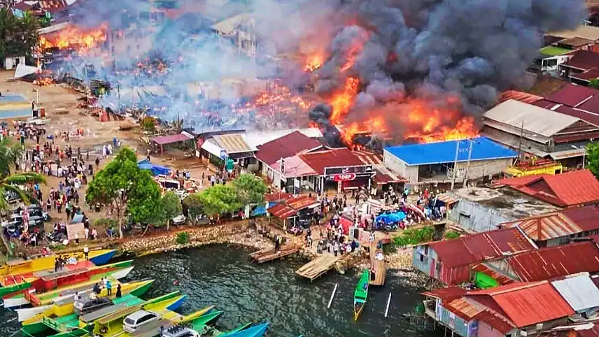Kebakaran hebat melanda permukiman padat penduduk di Sorowako, Kecamatan Nuha, Kabupaten Luwu Timur, Sulawesi Selatan, Rabu (27/8/2025).