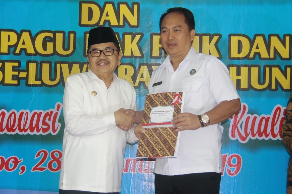 Direktur PKP2 Trans yang diwakili oleh Kasubdit Fasilitasi Penetapan Kawasan Transmigrasi Direktur Bina Potensi Kawasan Transmigrasi oleh Hidanafi Asrianti menyerahkan naskah SK penetapan kawasan transmigrasi Wara Palopo.