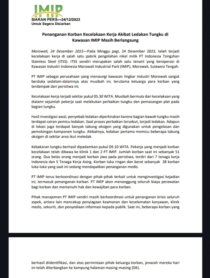 MOROWALI,SPIRITKITA — Puluhan korban dilaporkan akibat ledakan yang terjadi pada tungku PT ITSS pada Minggu, 24 Desember 2023, sekitar pukul 05:30. Menurut kesaksian, karyawan Pero Silicone PT ITSS sedang melakukan perbaikan pada tungku dan memasang plat pada bagian tersebut, yang menyebabkan ledakan hebat.