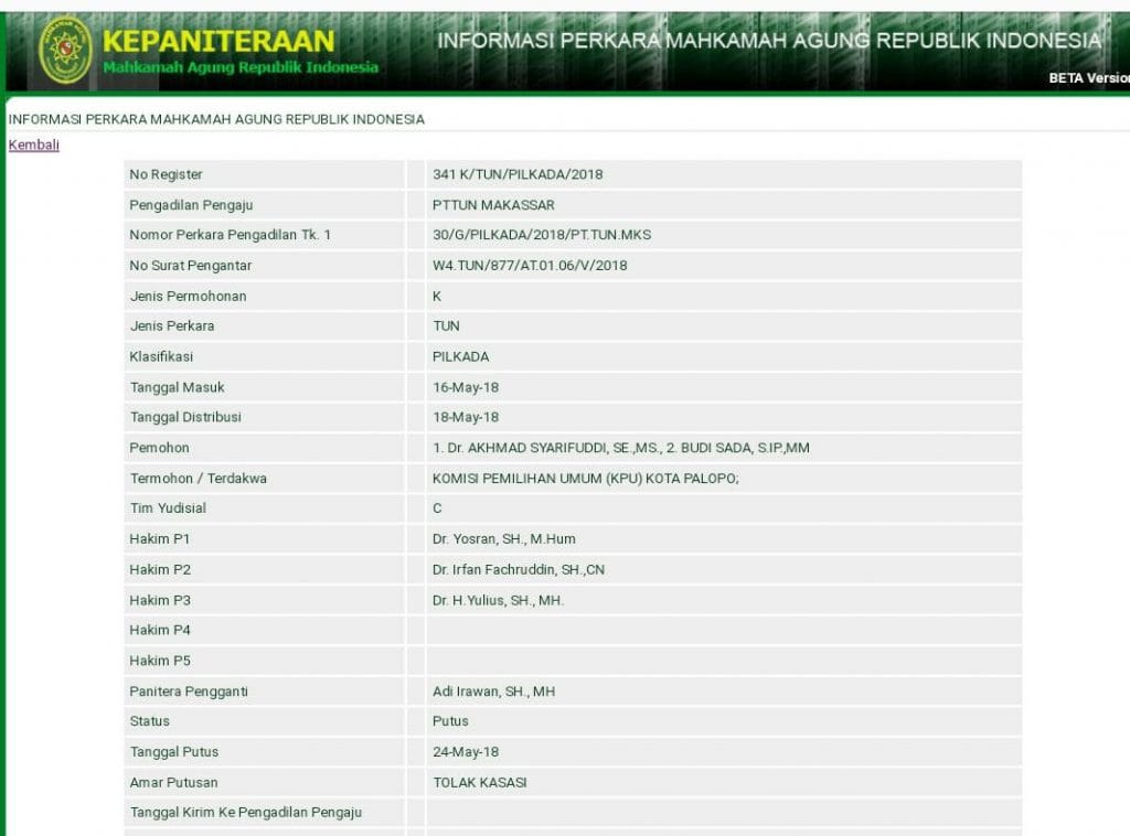 Putusan tersebut bisa dilihat di laman Informasi Perkara Mahkamah Agung RI per tanggal 24 Mei 2018.