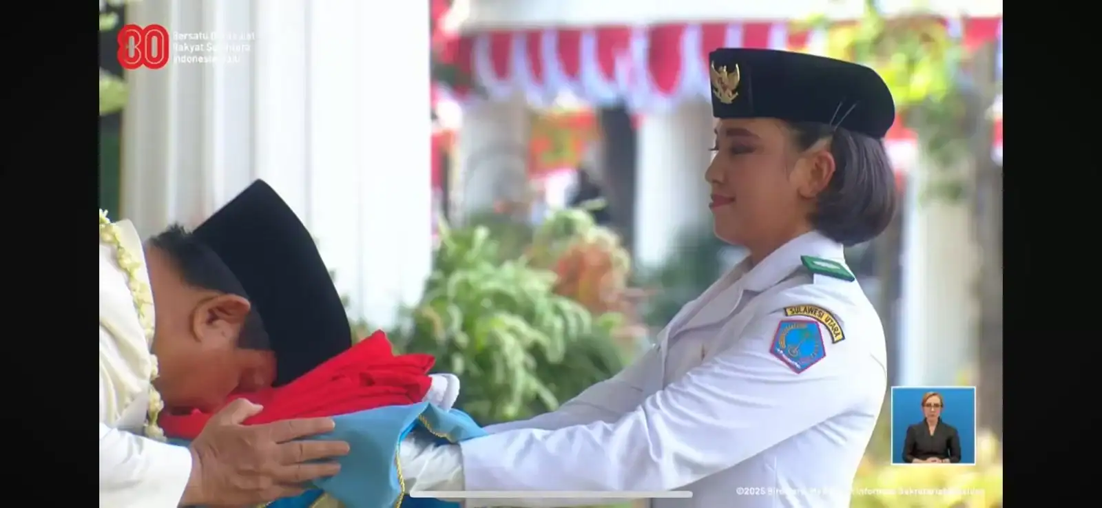 Dalam momen itu, Prabowo sempat mengusap lalu mencium bendera sebelum meletakkannya di baki yang dibawa oleh Bianca.