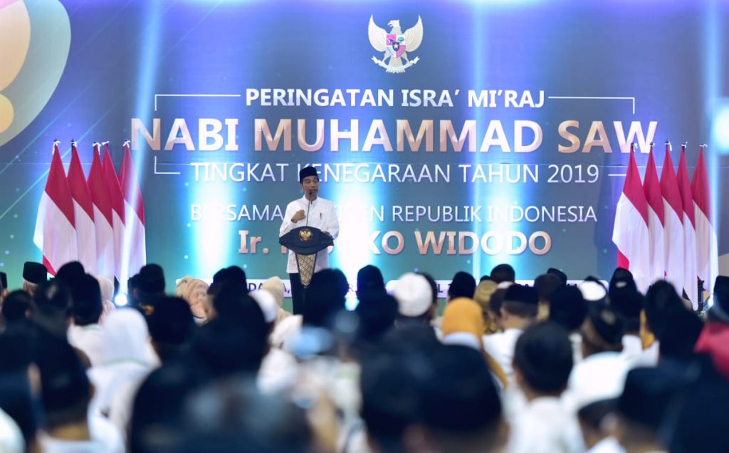 Presiden Joko Widodo dan Ibu Negara Iriana Joko Widodo malam ini menghadiri acara Peringatan Isra Mikraj Nabi Muhammad SAW Tingkat Nasional. Acara ini diadakan di GOR Pandawa, Sukoharjo, Jawa Tengah, Rabu 3 April 2019.