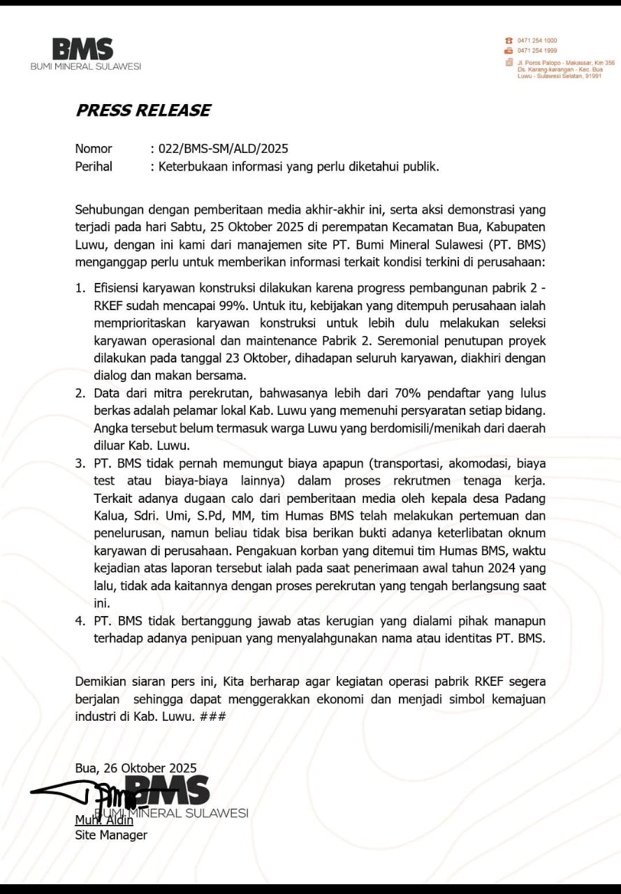 LUWU – Sehubungan dengan pemberitaan media akhir-akhir ini, serta aksi demonstrasi yang terjadi pada hari Sabtu, 25 Oktober 2025 di perempatan Kecamatan Bua, Kabupaten Luwu, dengan ini kami dari manajemen site PT. Bumi Mineral Sulawesi (PT BMS) menganggap perlu untuk memberikan informasi terkait kondisi terkini di perusahaan.