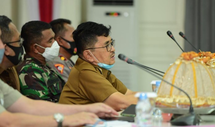 Pemerintah Kota (Pemkot) Palopo, menggelar rapat evaluasi penanganan Covid-19, di ruang pertemuan ratona, Kantor Walikota Palopo, Jalan Andi Djemma, Senin (5/7/2021). Rapat tersebut dílakukan, untuk mencermati meningkatnya kasus Covid-19. Juga sebagai bentuk upaya dan tindak lanjut kasus Covid-19 di kota bermotto ‘Idaman’ itu.