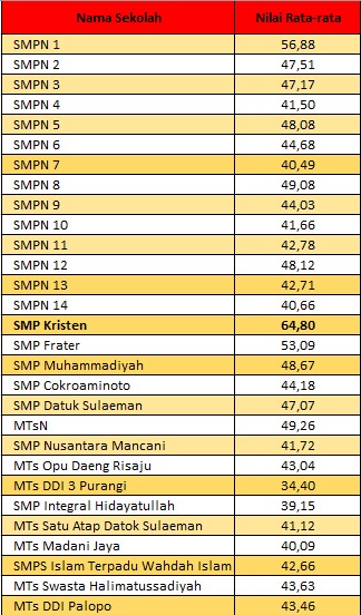 Paparan Balitbang Kemendikbud juga memperlihatkan, nilai rata-rata tertinggi diraih oleh SMP Kristen Palopo. Sekolah swasta ini meraih nilai rata-rata diatas rata-rata nasional yakni 64,80. Sementara, rata-rata nasional adalah 51,80.