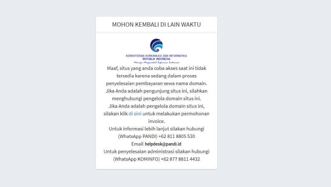 Namun ketika díakses pada Minggu, 22 Agustus 2021, yang sebelumnya tertulis “i’m under attack”, kini tertulis “Maaf, situs yang anda coba akses saat ini tidak tersedia karena sedang dalam proses penyelesaian pembayaran sewa nama domain. Jika Anda adalah pengunjung situs ini, silahkan menghubungi pengelola domain situs ini.”(red)