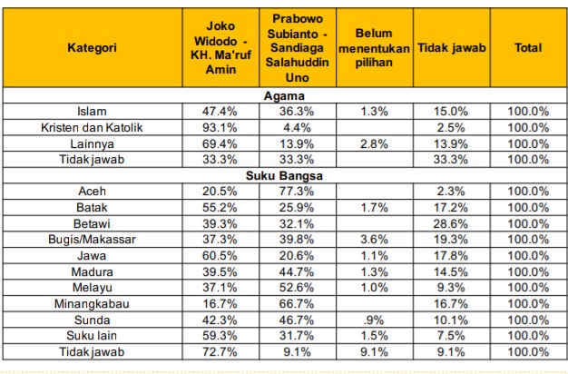 Pada crosstabulasi suku, Bugis Makassar, Aceh, Madura, Melayu, Minangkabau dan Sunda lebih cenderung memilih capres 02.(****)