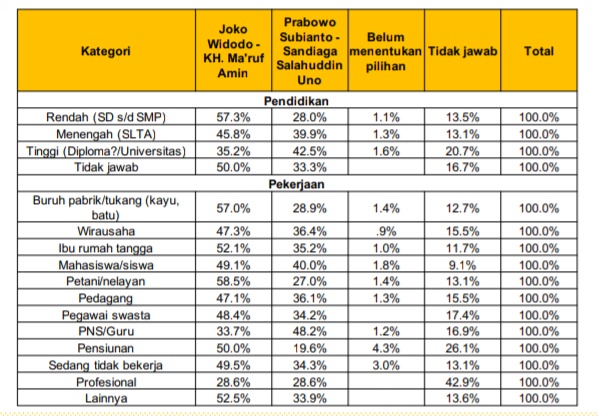 Sementara, buruh, wirausaha, ibu rumah tangga, Siswa/Mahasiswa, Petani/nelayan, pedagang, swasta, pengangguran dan profesi lainnya kebanyakan memilih capres 01, Jokowi-Amin. Untuk pekerja profesional, pilihannya seimbang, sama-sama 28.6%.