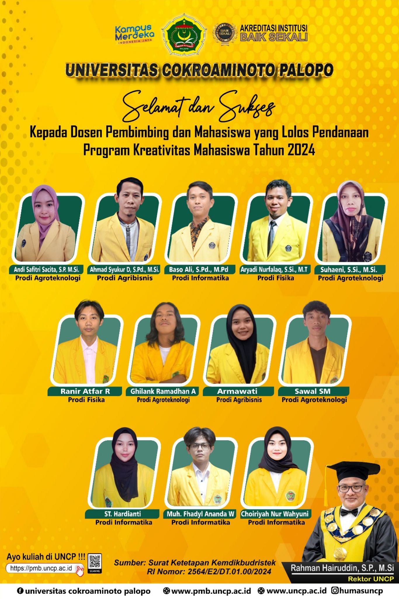 PALOPO, SPIRITKITA — Universitas Cokroaminoto Palopo (UNCP) kembali menunjukkan prestasinya di wilayah kerja LLDikti Wilayah IX Sultan Batara. UNCP berhasil meraih pendanaan Program Kreativitas Mahasiswa (PKM) 8 bidang menurut Surat Ketetapan Kemdikbudristek RI Nomor: 2564/E2/DT.01.00/2024 yang tersedia di laman Simbelmawa.kemendikbud.go.id.