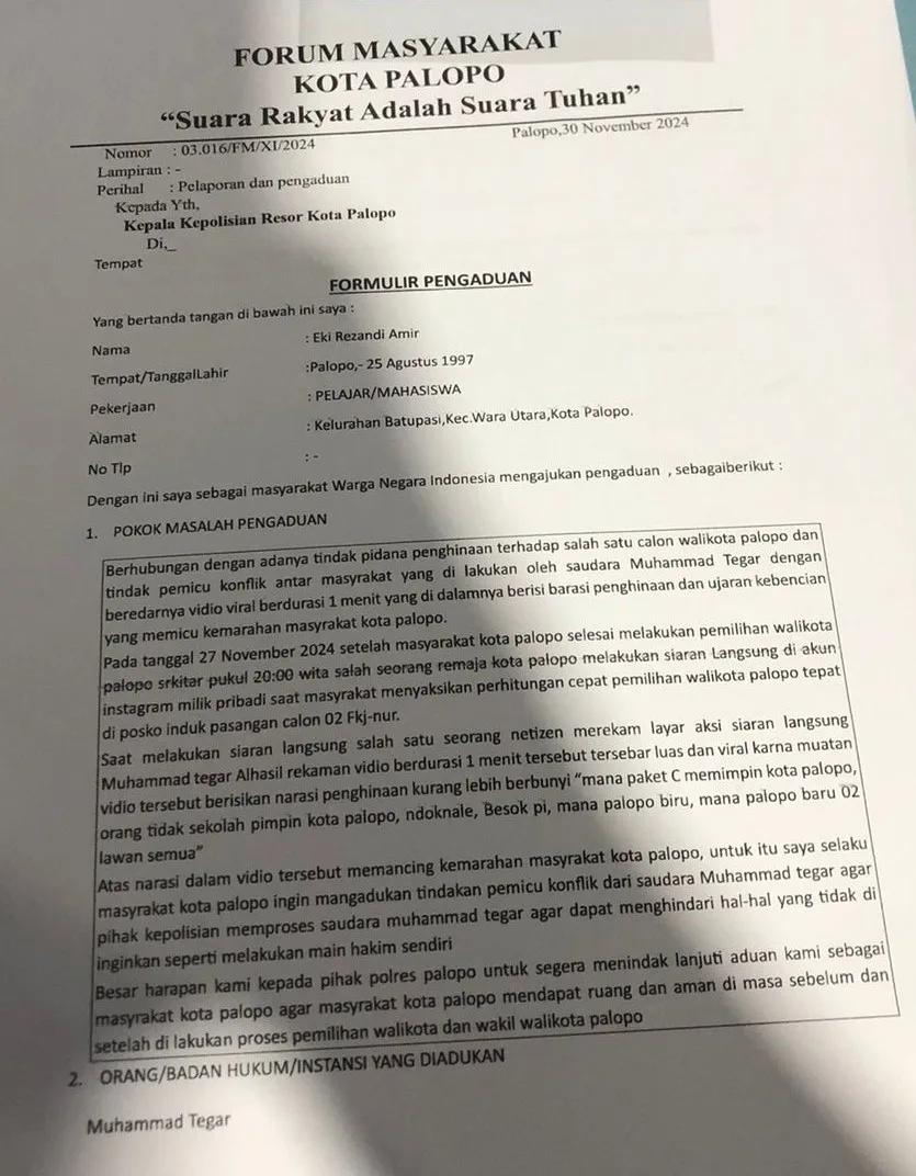 PALOPO, SPIRITKITA – Seorang warga Palopo, Eki Rezandi, resmi melaporkan Muhammad Tegar ke Polres Palopo terkait konten video yang dianggap meresahkan dan berpotensi memicu konflik sosial.