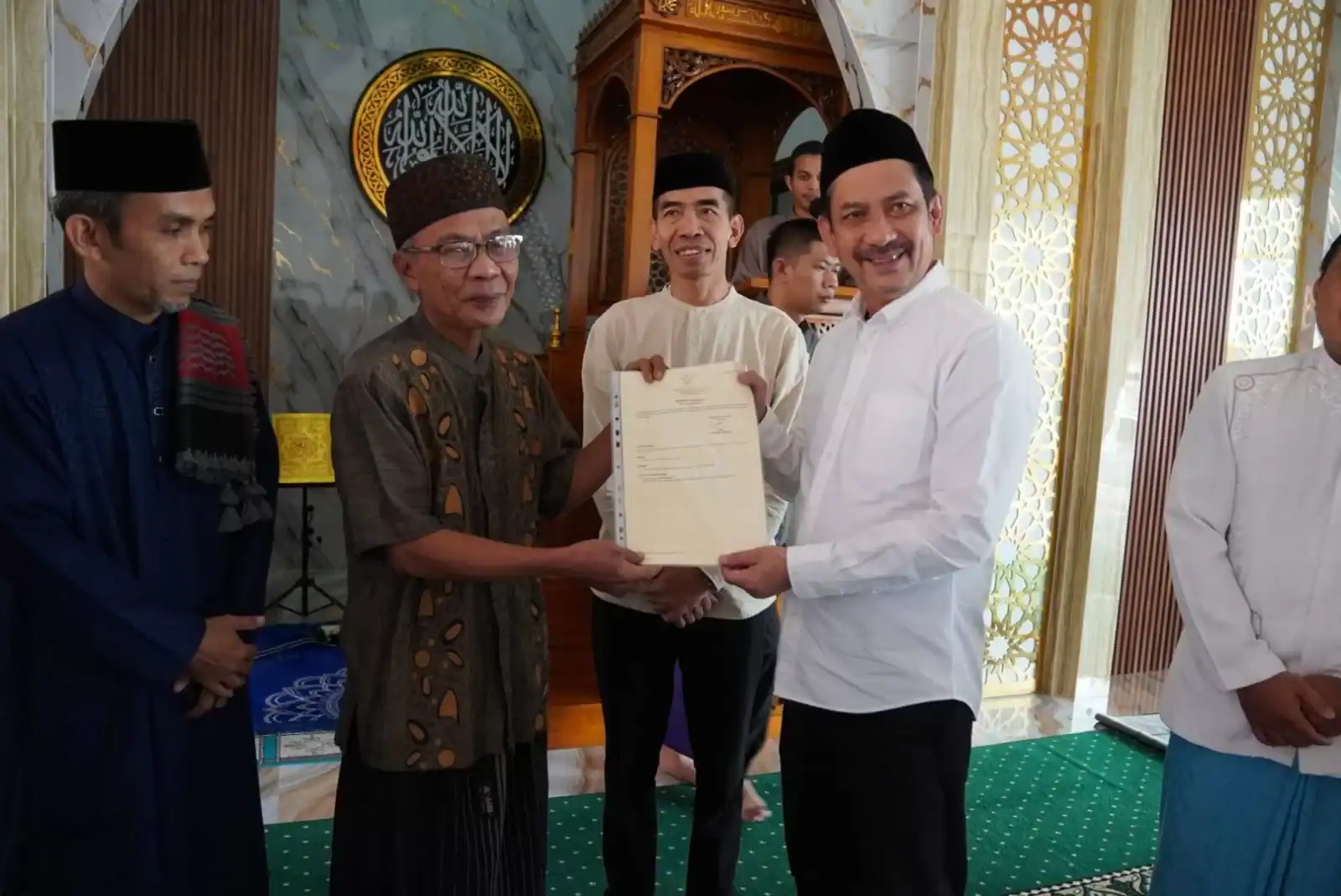 Dalam kunjungan ini, ia sekaligus menyerahkan sertifikat wakaf atas nama masjid sebagai bentuk kepastian hukum atas aset rumah ibadah.